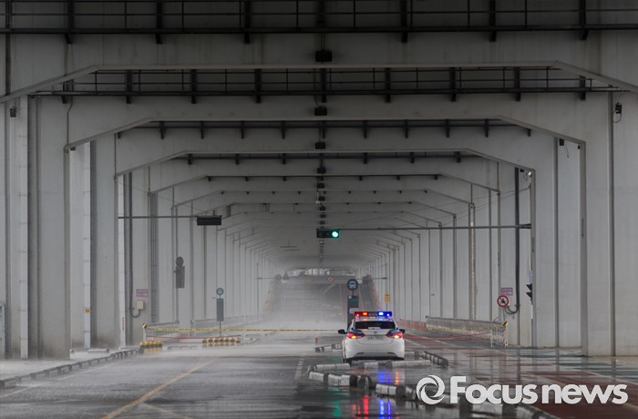 (서울=포커스뉴스) 장마전선이 북상하면서 전국 곳곳에 호우특보가 발표 중인 5일 오전 서울 서초구 잠수교가 통제되고 있다.