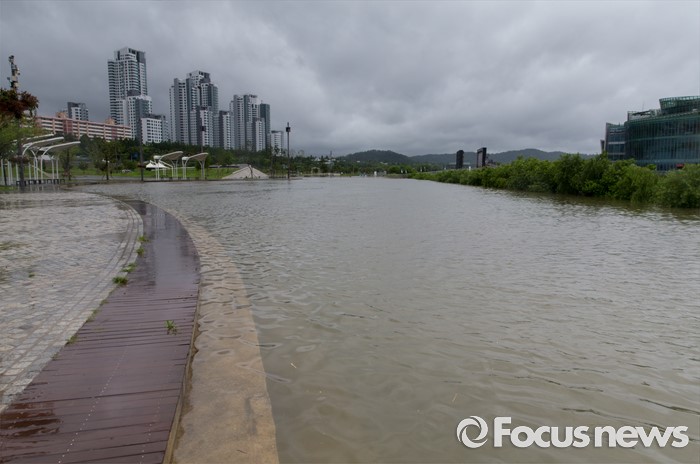 (서울=포커스뉴스) 장마전선이 북상하면서 전국 곳곳에 호우특보가 발표 중인 5일 오전 서울 서초구 반포한강시민공원이 물에 잠기고 있다.