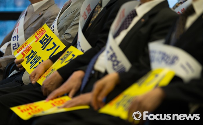 (서울=포커스뉴스) 북핵폐기천만인서명운동본부 등 시민단체 관계자들이 5일 오전 서울 중구 프레스센터에서 열린 북핵폐기 천만인서명, 250만명 돌파 기자회견에 참석해 손피켓을 들고 있다.