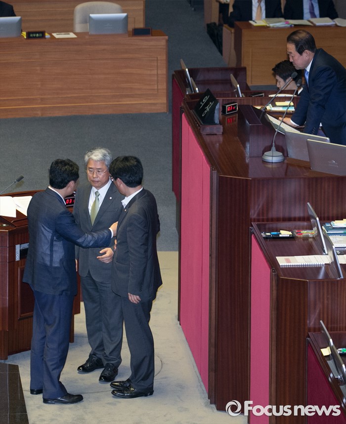 (서울=포커스뉴스) 5일 오전 서울 여의도 국회에서 열린 343회 국회(임시회) 7차 본회의, 정치·외교·통일·안보·교육·사회·문화에 관한 질문에 참석한 이장우 새누리당 의원 등과 김동철 국민의당 의원이 언쟁을 벌이자 박완주 더불어민주당 원내수석부대표, 김관영 국민의당 원내수석부대표가 단상 위의 김동철 의원과 대화하고 있다.