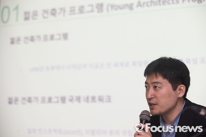 (서울=포커스뉴스) 5일 오전 서울 종로구 국립현대미술관 서울관에서 열린 '젊은 건축가 프로그램 2016' 기자간담회에 참석한 박근태 학예연구사가 프로그램을 소개하고 있다.