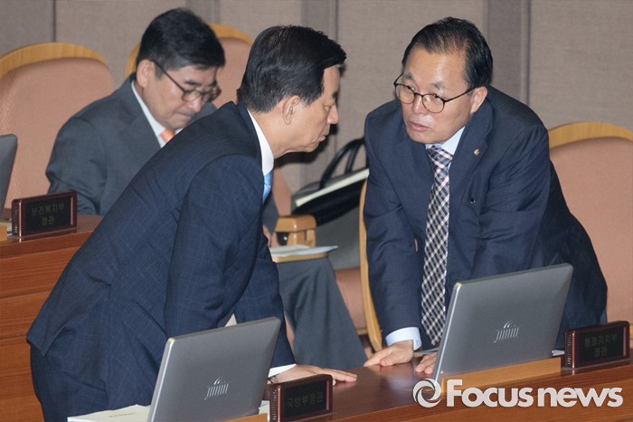 (서울=포커스뉴스) 5일 오전 서울 여의도 국회에서 열린 343회 국회(임시회) 7차 본회의, 정치·외교·통일·안보·교육·사회·문화에 관한 질문에 참석한 한민구(왼쪽) 국방부 장관과 이채익 새누리당 의원이 대화하고 있다.