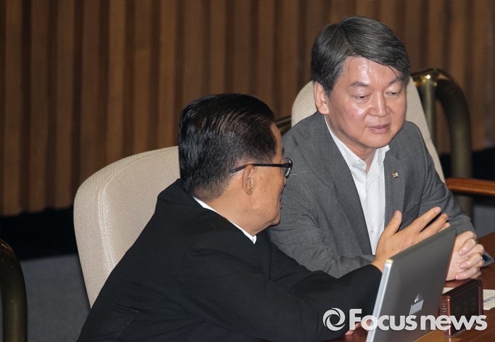(서울=포커스뉴스) 5일 오전 서울 여의도 국회에서 열린 343회 국회(임시회) 7차 본회의, 정치·외교·통일·안보·교육·사회·문화에 관한 질문에 참석한 안철수(오른쪽) 국민의당 전 대표, 박지원 비대위원장이 대화하고 있다.