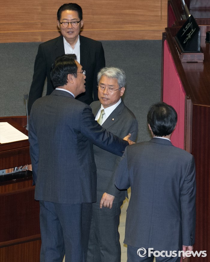 (서울=포커스뉴스) 5일 오전 서울 여의도 국회에서 열린 343회 국회(임시회) 7차 본회의, 정치·외교·통일·안보·교육·사회·문화에 관한 질문에 참석한 김동철 국민의당 의원과 이장우 새누리당 의원 등이 언쟁을 벌이자 정진석 새누리당 원내대표, 우상호 더불어민주당 원내대표, 박지원 국민의당 원내대표가 만류하고 있다.