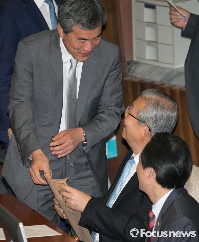 (서울=포커스뉴스) 5일 오전 서울 여의도 국회에서 열린 343회 국회(임시회) 7차 본회의, 정치·외교·통일·안보·교육·사회·문화에 관한 질문에 참석한 김종인(가운데) 더불어민주당 비대위 대표와 이상돈(왼쪽) 국민의당 의원이 대화하고 있다.