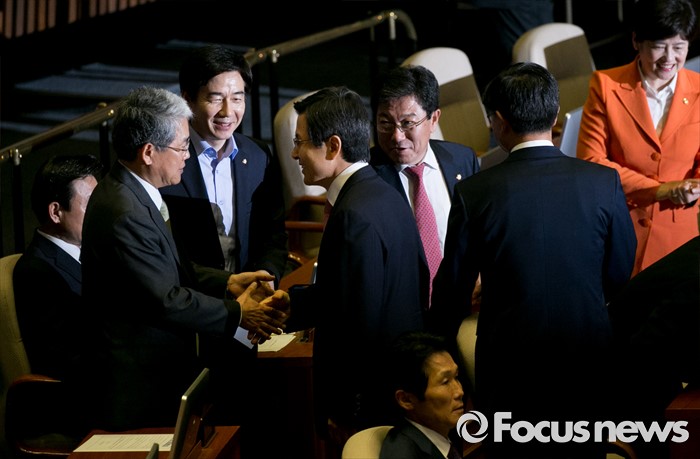 (서울=포커스뉴스) 5일 오후 서울 여의도 국회에서 열린 343회 국회(임시회) 7차 본회의, 정치·외교·통일·안보·교육·사회·문화에 관한 질문에 참석한 황교안 국무총리가 회의 속개를 기다리며 김동철 국민의당 의원과 악수하고 있다. 이날 대정부 질문은 이장우 새누리당 의원 등과 김동철 국민의당 의원의 언쟁으로 오전 회의가 정회됐었다.