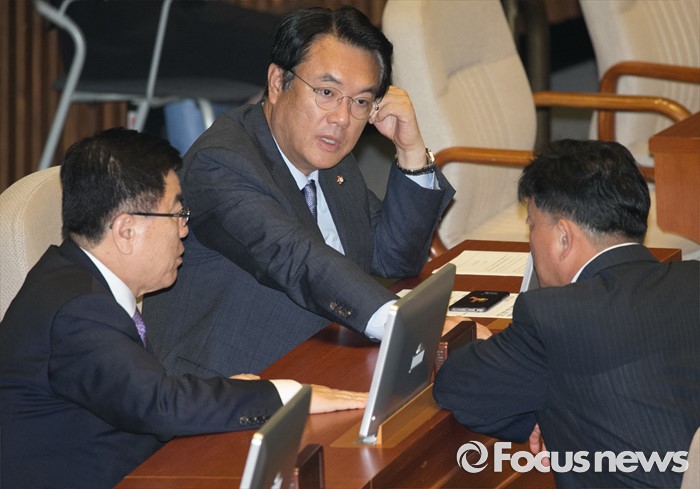 (서울=포커스뉴스) 5일 오후 서울 여의도 국회에서 열린 343회 국회(임시회) 7차 본회의, 정치·외교·통일·안보·교육·사회·문화에 관한 질문에 참석한 정진석(가운데) 새누리당 원내대표, 김광림(왼쪽) 정책위의장, 김명연 의원이 대화하고 있다.