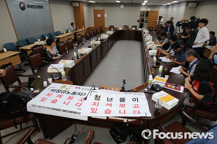(세종=포커스뉴스) 5일 오후 세종시 정부세종청사 고용노동부 최저임금위원회에서 열린 제9차 전원회에서근로자 위원 자리에 '비정규직노동자가 지켜보고 있다', '청년들이 지켜보고 있다' 문구가 적힌 현수막이 올려져 있다.