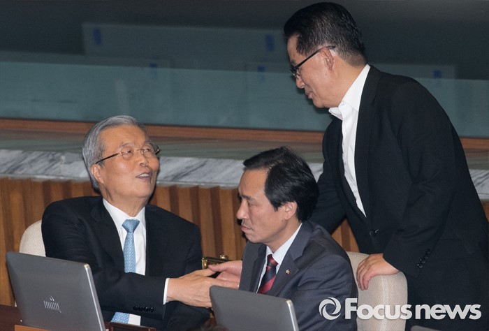 (서울=포커스뉴스) 5일 오후 서울 여의도 국회에서 열린 343회 국회(임시회) 7차 본회의, 정치·외교·통일·안보·교육·사회·문화에 관한 질문에 참석한 김종인(왼쪽) 더불어민주당 비대위 대표와 박지원(오른쪽) 국민의당 비대위원장이 악수하고 있다. 가운데는 우상호 더민주 원내대표.