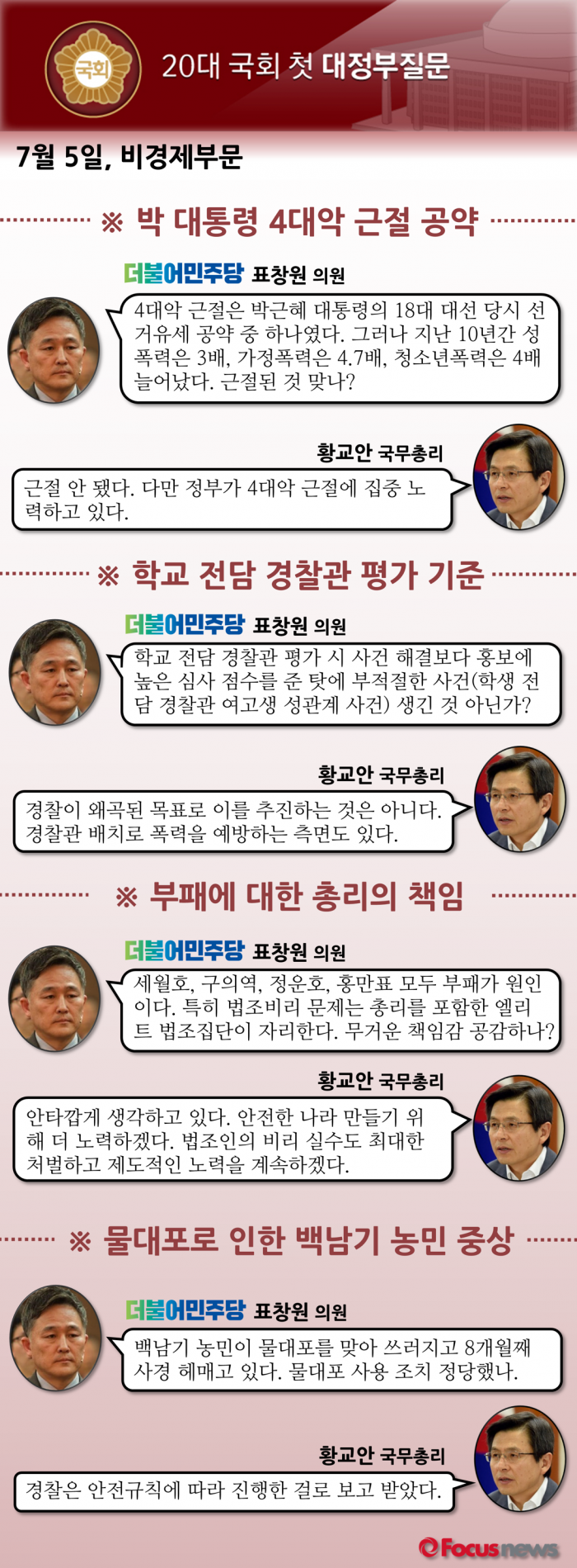 (서울=포커스뉴스) 20대 국회 첫 대정부 질문 이튿날 일정이 5일 오전 10시 국회에서 시작됐다. 4일에는 경제부문을, 5일은 비경제부문을 집중적으로 다뤘다.