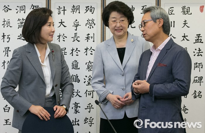 (서울=포커스뉴스) 6일 오전 서울 여의도 국회 귀빈식당에서 열린 미래인사포럼 창립총회에 참석한 나경원(왼쪽부터), 김승희 새누리당 의원과 이근면 전 인사혁신처장이 대화하고 있다.