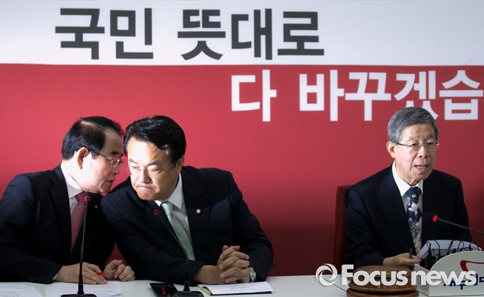 (서울=포커스뉴스) 6일 오전 서울 여의도 국회에서 열린 새누리당 혁신비상대책위원회의에 참석한 정진석(가운데) 원내대표와 박명재(왼쪽) 사무총장이 대화하고 있다. 오른쪽은 김희옥 위원장.