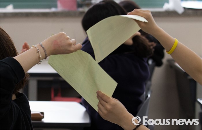 (서울=포커스뉴스) 7월 전국연합학력평가가 실시된 6일 오전 서울 은평구 신도고등학교에서 3학년 학생들이 답안지를 건네고 있다.