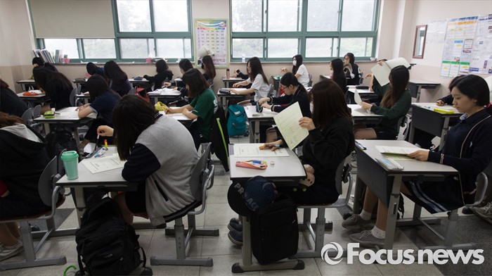 (서울=포커스뉴스) 7월 전국연합학력평가가 실시된 6일 오전 서울 은평구 신도고등학교에서 3학년 학생들이 1교시 국어영역 시험을 치르고 있다.