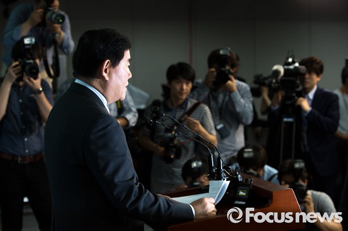 (서울=포커스뉴스) 최경환 새누리당 의원이 6일 오전 서울 여의도 국회에서 새누리당 당대표를 선출하는 전당대회 불출마 선언 하고 있다.