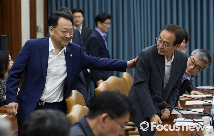 (서울=포커스뉴스) 6일 오전 서울 종로구 정부서울청사에서 열린 제19차 재정전략협의회에 자리한 유일호(왼쪽) 경제부총리 겸 기획재정부 장관이 참석자들과 인사하고 있다.
