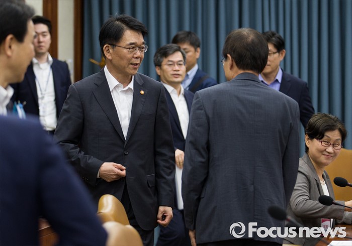 (서울=포커스뉴스) 6일 오전 서울 종로구 정부서울청사에서 열린 제19차 재정전략협의회에 참석한 강호인(왼쪽 두번째) 국토교통부 장관이 참석자들과 인사하고 있다.