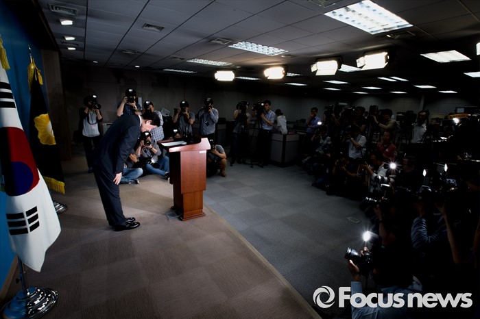 (서울=포커스뉴스) 최경환 새누리당 의원이 6일 오전 서울 여의도 국회에서 새누리당 당대표를 선출하는 전당대회 불출마 선언을 마친 뒤 인사 하고 있다.