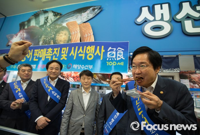 (서울=포커스뉴스) 김영석 해양수산부 장관을 비롯한 수협 관계자 들이 6일 오전 서울 용산구 롯데마트 서울역점을 방문해 최근 미세먼지 논란으로 소비가 위축된 고등어 소비 활성화를 위해 판촉 및 시식 행사에 참여하고 있다. 지난 5월 '고등어를 구울 때 미세먼지가 발생한다'는 환경부의 발표이후 소비둔화로 이어져, 고등어를 찾는 사람이 급격히 줄었다.