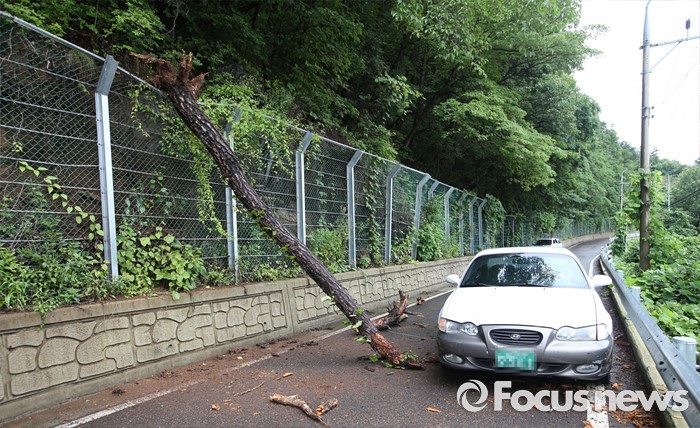 (옥천=포커스뉴스) 며칠간 이어진 중부지역 집중호우로 6일 오후 충북 옥천군 군복면 도로에 나무가 쓰려져 있다.