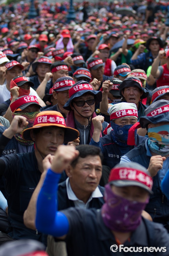 (서울=포커스뉴스) 전국건설노동조합 조합원들이 6일 오후 서울역광장에서 총파업 집회에 앞서 건설사 직접 시공제 도입 등 18대 대정부 요구안 제시를 촉구하는 구호를 외치고 있다.
