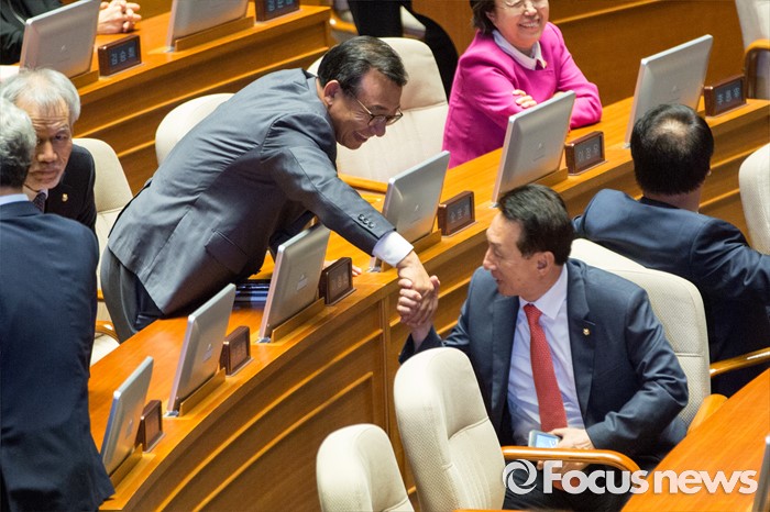 (서울=포커스뉴스) 이정현(왼쪽) 새누리당 의원과 김석기 새누리당 의원이6일 오후 서울 여의도 국회에서 열린 '제343회 국회(임시회) 제8차 본회의'에 참석해 악수 하고 있다.