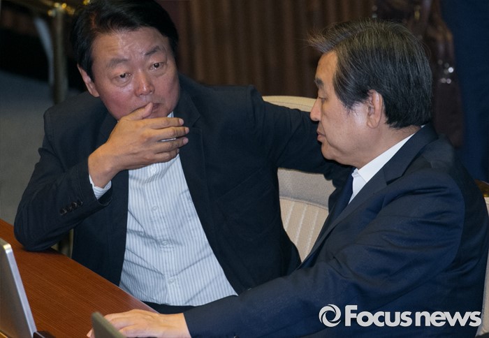 (서울=포커스뉴스) 6일 오후 서울 여의도 국회에서 열린 343회 국회(임시회) 8차 본회의에 참석한 김무성(오른쪽) 새누리당 전 대표와 한선교 의원이 대화하고 있다.