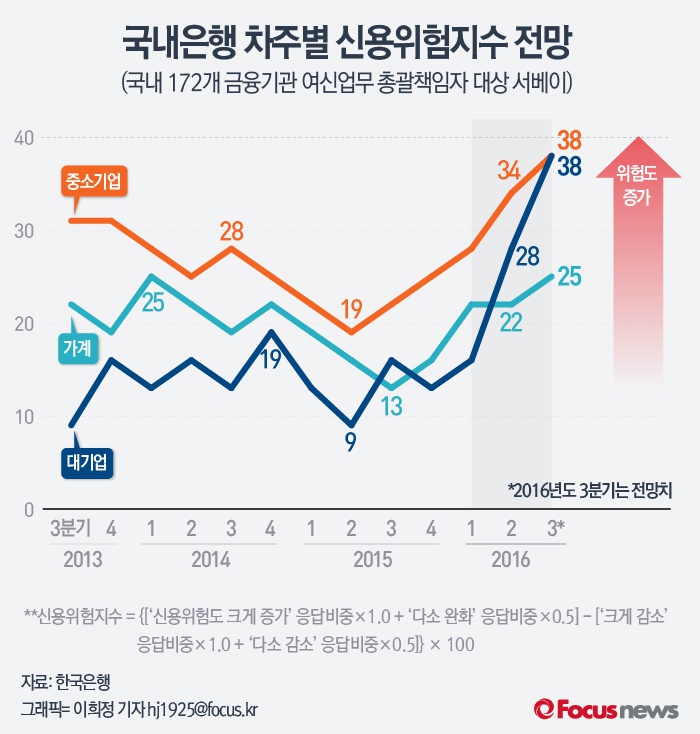 (서울=포커스뉴스) 6일 한국은행이 172개 금융기관 여신업무 총괄 책임자를 대상으로 조사한 '금융기관 대출행태서베이 결과'에 따르면 2016년 3분기에 대기업, 중소기업, 가계 모두 국내은행의 신용위험도가 증가할 것으로 전망됐다. 특히 대기업 신용위험이 크게 높아질 것으로 응답했다.