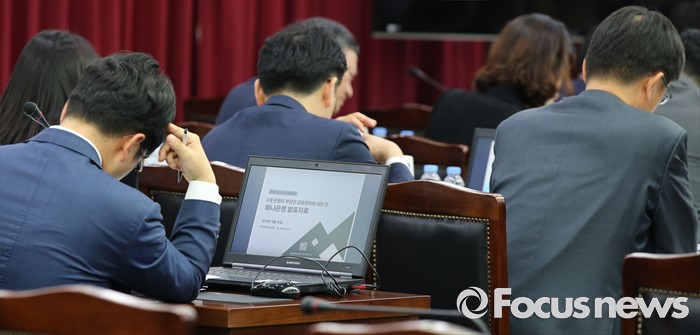 (세종=포커스뉴스) 지난달 22일 세종시 정부세종청사 공정거래위원회 심판정에서 열린 6개 시중은행(국민·농협·신한·우리·하나·SC은행)의 양도성예금증서(CD)금리 담합의혹에 대한 심의에 앞서 은행관계자들이 발표자료를 준비하고 있다. 6일 공정위 전원회의는 CD금리 담합과 관련해 법 위반 여부를 결정하기 어렵다고 판단, 심의절차를 종료 한다고 밝혔다.