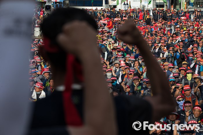 (서울=포커스뉴스) 6일 오후 서울 중구 서울시청광장에서 열린 '건설노동자 총력투쟁 결의대회'에 참석한 조합원들이 안전한 건설현장을 촉구하며 구호를 외치고 있다.