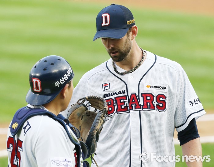 (서울=포커스뉴스) 6일 서울 잠실구장에서 열린 2016 프로야구 넥센-두산 경기에서 두산 투수 니퍼트가 2회 수비를 마치고 포수 양의지에게 자신의 투구에 대해 묻고 있다.