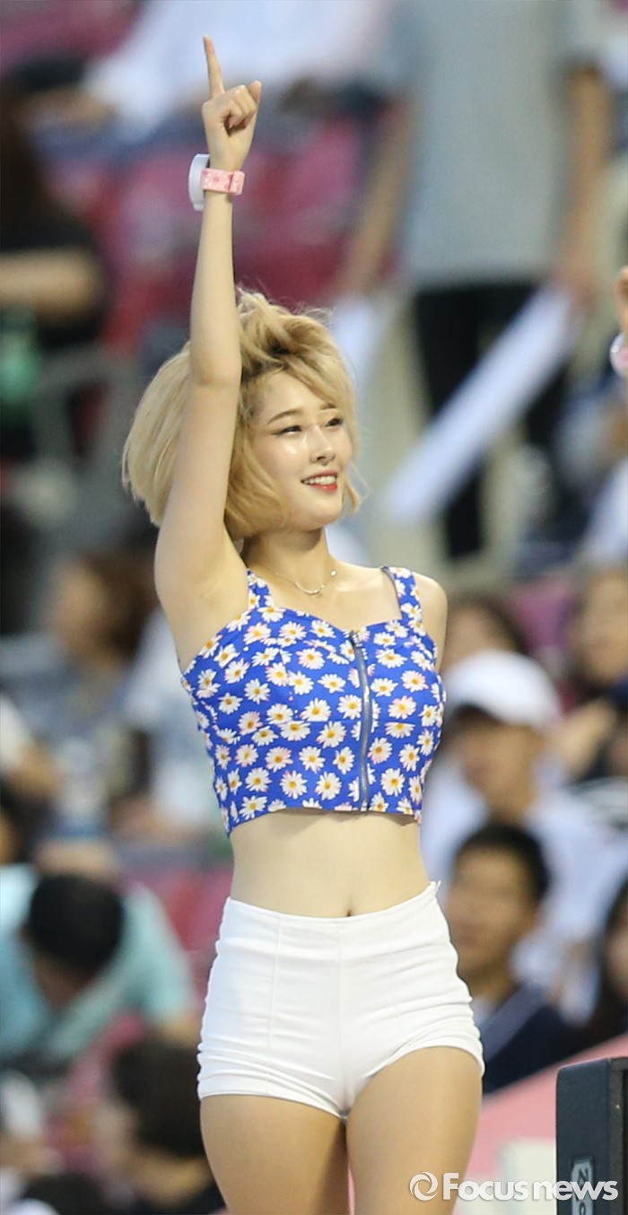 (서울=포커스뉴스) 6일 서울 잠실구장에서 열린 2016 프로야구 넥센-두산 경기에서 두산 치어리더가 비온 후의 선선한 여름밤에 열기를 더 하고 있다.