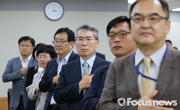 다만 고용노동부 장관 고시일(8월5일)의 20일 전(7월16일)까지만 최저임금 합의안이 도출되면 법적으로 문제가 없어 노사 합의까지는 예상보다 며칠이 더 소요될 거란 관측도 있다.5일 세종시 정부세종청사 고용노동부 최저임금위원회에서 열린 제9차 전원회의에서 박준성 위원장과 위원들이 국기에 대한 경례를 하고 있다. 2016.07.05 김기태 기자