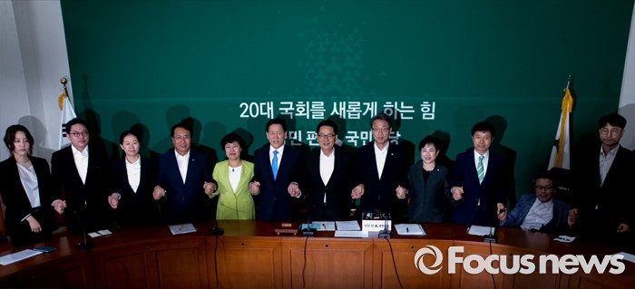(서울=포커스뉴스) 7일 오전 서울 여의도 국회에서 열린 국민의당 첫 비상대책위원회의에 참석한 박지원 비대위원장과 비대위원들이 손을 잡고 취재진을 향해 포즈를 취하고 있다.