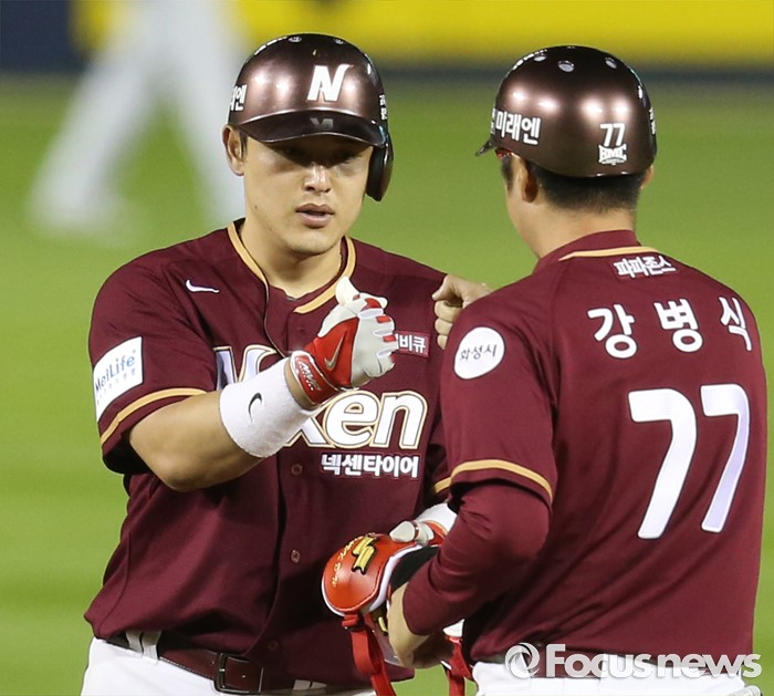 (서울=포커스뉴스) 6일 서울 잠실구장에서 열린 2016 프로야구 넥센-두산 경기 9회초 1사 2루에서 넥센 박동원이 좌중간 2루타로 2루주자를 불러들이고 강병식 코치의 축하를 받고 있다.
