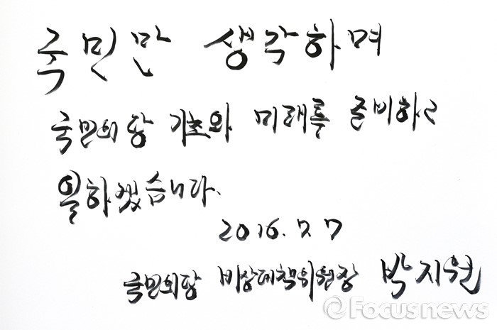 (서울=포커스뉴스) 박지원 국민의당 비상대책위원장이 7일 오전 동작구 국립서울현충원을 방문해 현충탑을 참배한 뒤 방명록을 작성했다. 사진은 박 위원장이 남긴 글귀.
