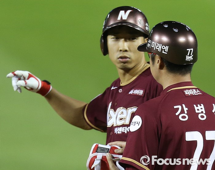 (서울=포커스뉴스) 6일 서울 잠실구장에서 열린 2016 프로야구 넥센-두산 경기 7회초 2사 1,2루에서 넥센 고종욱이 중전 안타로 동점 주자를 불러 들이고 1루에서 강병식 코치와 대화하고 있다.