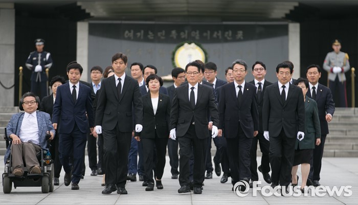 (서울=포커스뉴스) 박지원 국민의당 비상대책위원장과 비대위원 등이 7일 오전 동작구 국립서울현충원을 방문해 현충탑 참배를 마친 뒤 나서고 있다.