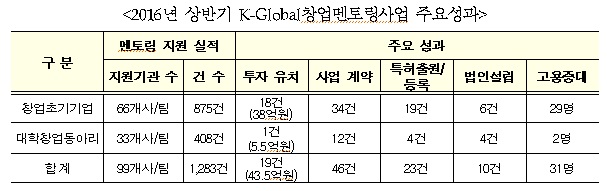 정완용 미래창조과학부 정보통신산업정책관은 “케이글로벌 창업멘토링 사업을 통해 벤처 최고 경영자(CEO)출신의 멘토들의 경험과 노하우가 밑거름이 되어 창업에 성공하기를 기대한다“고 말했다.케이글로벌 창업멘토링사업 주요성과.<표제공=미래부>