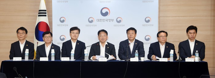 (서울=포커스뉴스) 유일호 부총리 겸 기획재정부 장관이 7일 서울 종로구 정부서울청사에서 '제10차 무역투자진흥회의' 결과 관계부처 합동브리핑에서 모두발언을 하고 있다. 왼쪽부터 강호인 국토부 장관, 정진엽 복지부 장관, 최양희 미래부 장관, 유일호 부총리, 주형환 산업부 장관, 이동필 농식품부 장관, 손문기 식약처장. <사진제공=기획재정부>