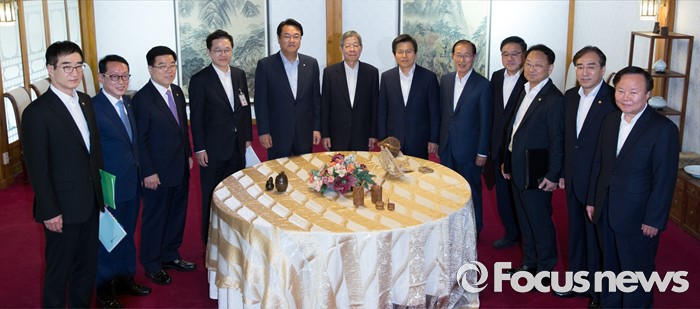 (서울=포커스뉴스) 7일 오후 서울 종로구 삼청동 국무총리공관에서 열린 당·정·청 정책조정협의회에서 참석자들이 기념촬영을 하고 있다. 왼쪽부터 이준식 사회부총리 겸 교육부 장관, 김도읍 새누리당 원내수석부대표, 김광림 정책위의장, 강석훈 청와대 경제수석, 정진석 새누리당 원내대표, 김희옥 혁신비상대책위원장, 황교안 국무총리, 이원종 대통령 비서실장, 안종범 청와대 정책조정수석, 유일호 경제부총리 겸 기획재정부 장관, 이석준 국무조정실장, 김재원 청와대 정무수석.