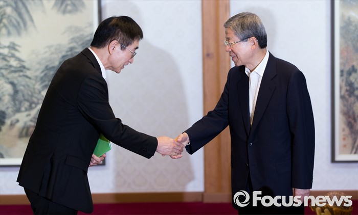 (서울=포커스뉴스) 7일 오후 서울 종로구 삼청동 국무총리공관에서 열린 당·정·청 정책조정협의회에서 김희옥(오른쪽) 새누리당 혁신비상대책위원장이 이준식 사회부총리 겸 교육부 장관과 인사를 나누고 있다.