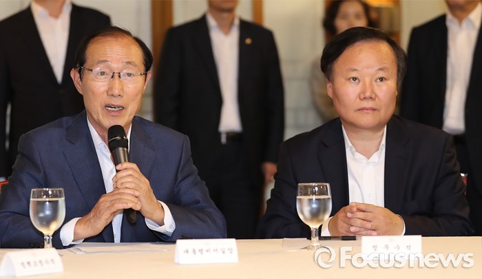 (서울=포커스뉴스) 7일 오후 서울 종로구 삼청동 국무총리공관에서 열린 당·정·청 정책조정협의회에서 이원종(왼쪽) 대통령 비서실장이 모두발언을 하고 있다. 오른쪽은 김재원 청와대 정무수석.