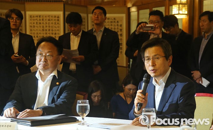 (서울=포커스뉴스) 7일 오후 서울 종로구 삼청동 국무총리공관에서 열린 당·정·청 정책조정협의회에서 황교안(오른쪽) 국무총리가 모두발언을 하고 있다. 왼쪽은 유일호 경제부총리 겸 기획재정부 장관.