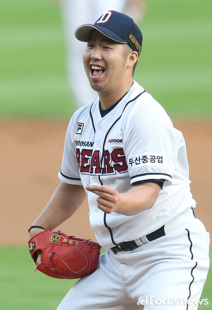 (서울=포커스뉴스) 6일 서울 잠실구장에서 열린 2016 프로야구 넥센-두산 경기 2회초 2사 1,2루에서 두산 투수 유희관이 넥센 이택근에게 투구후 아쉬워하고 있다.