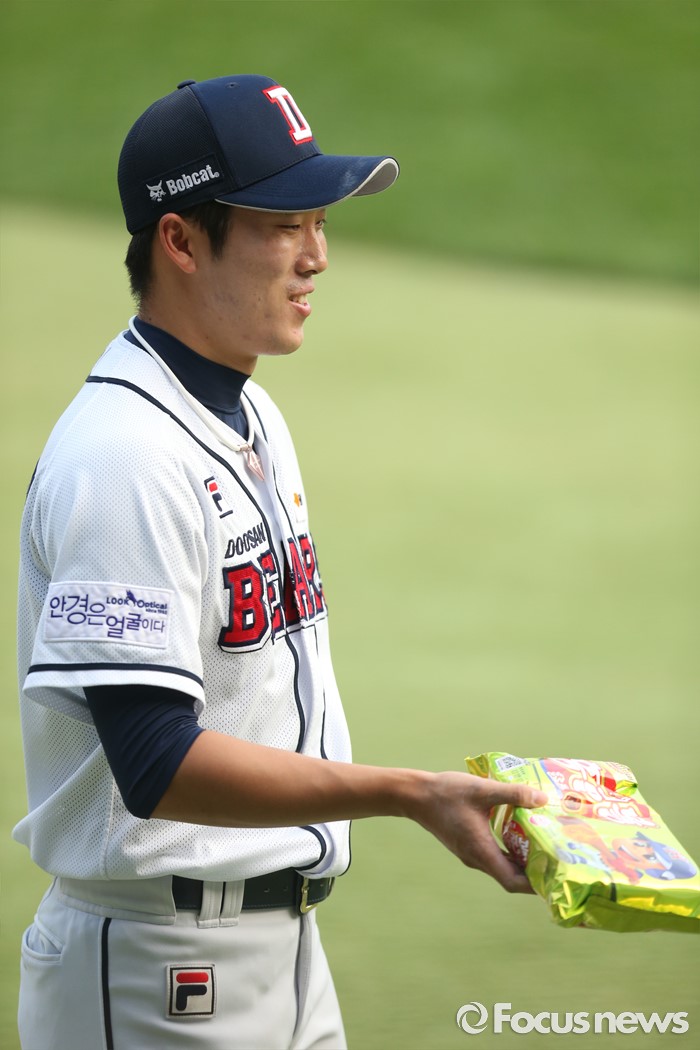 (서울=포커스뉴스) 6일 서울 잠실구장에서 열린 2016 프로야구 넥센-두산 경기에 앞서 두산 허경민이 박건우의 홈런상 부상으로 전달된 과자를 들고 있다.