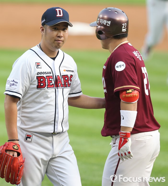 (서울=포커스뉴스) 6일 서울 잠실구장에서 열린 2016 프로야구 넥센-두산 경기 두산 투수 유희관이 2회초 수비를 마치고 넥센 박동원을 비켜 지나가고 있다.