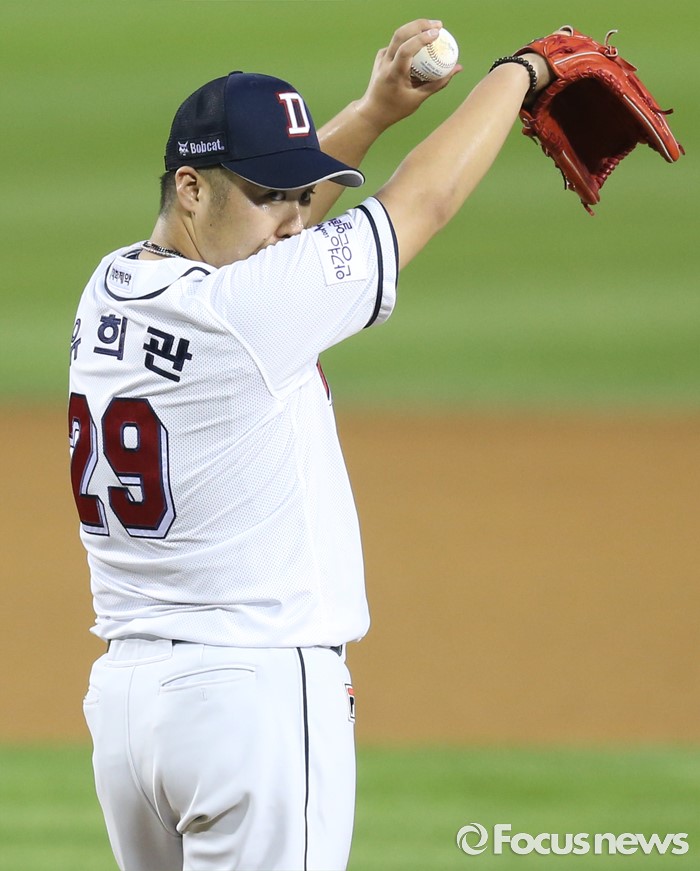 (서울=포커스뉴스) 6일 서울 잠실구장에서 열린 2016 프로야구 넥센-두산 경기 6회초 두산 투수 유희관이 연속 2루타로 실점하고 얼굴의 땀을 닦고 있다.