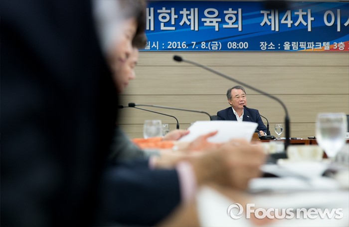 (서울=포커스뉴스) 8일 오전 서울 송파구 올림픽파크텔에서 열린 대한체육회 제4차 긴급 임시 이사회에서 강영중 대한체육회 회장이 인사말을 하고 있다. 이번 임시 이사회에서는 박태환의 리우 올림픽 출전 여부가 긴급 안건으로 상정됐다.