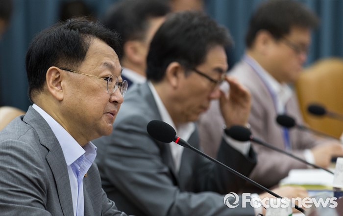 (서울=포커스뉴스) 유일호(왼쪽) 경제부총리 겸 기획재정부 장관이 8일 오전 서울 종로구 정부서울청사에서 열린 제182차 대외경제장관회의에 자리해 모두발언 하고 있다.
